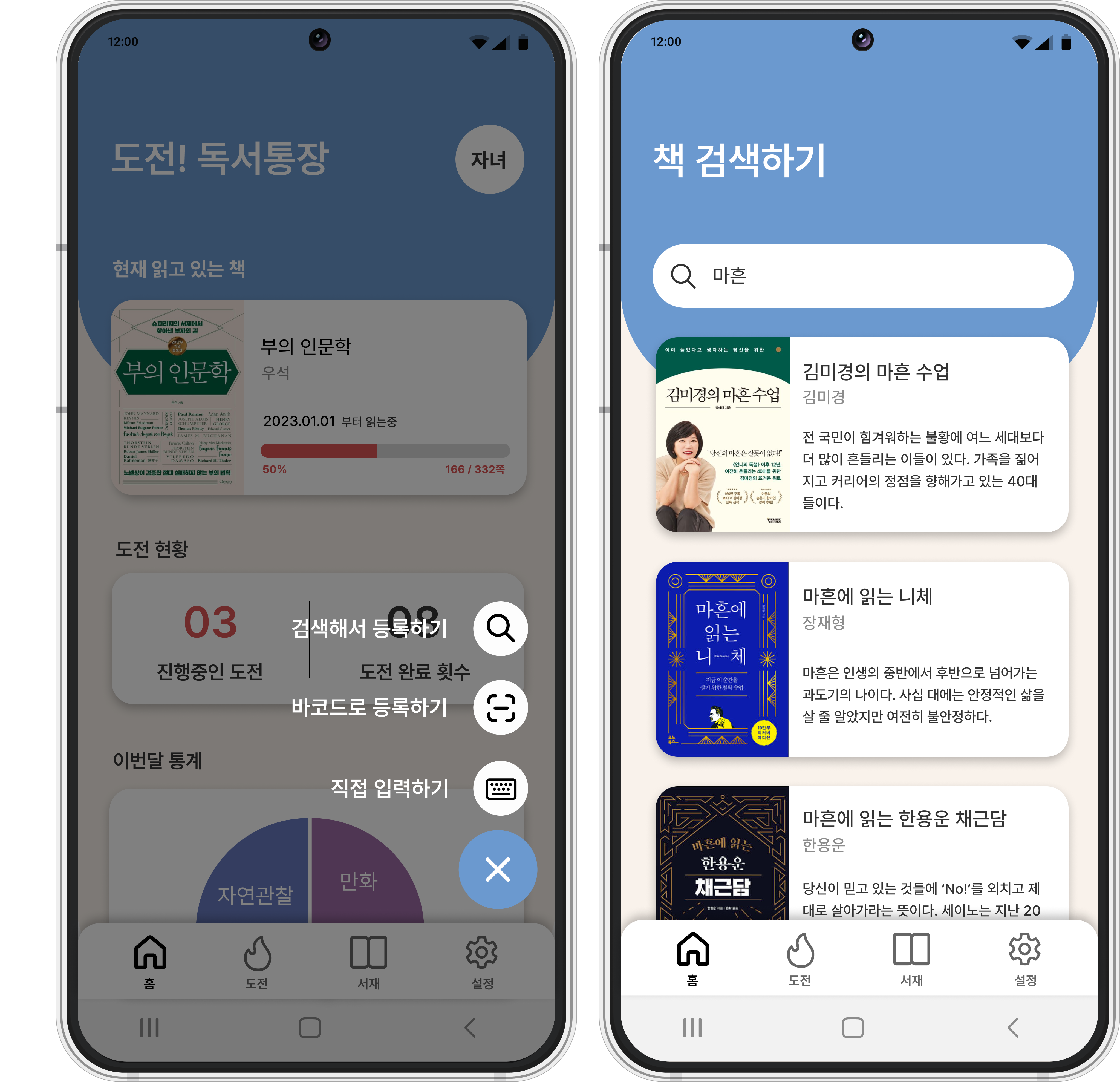 현재 읽고 있는 책과 어플의 상징성인 '도전 현황'을 메인 화면에서 항상 확인할 수 있도록